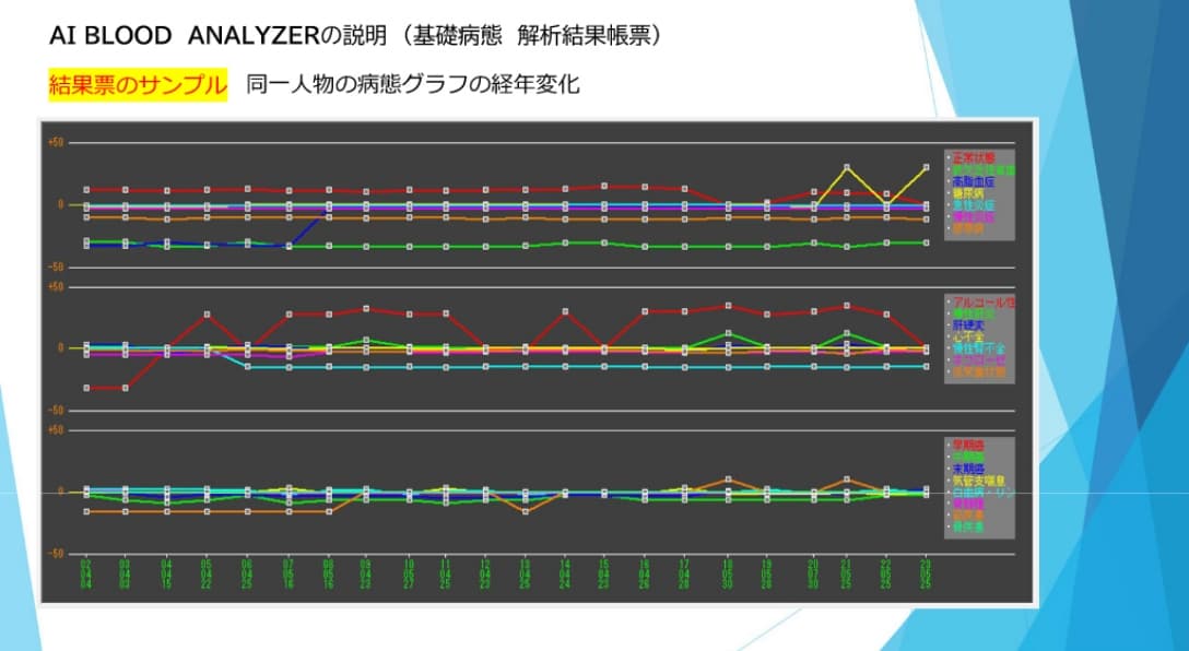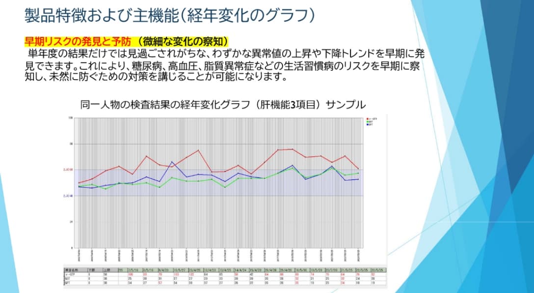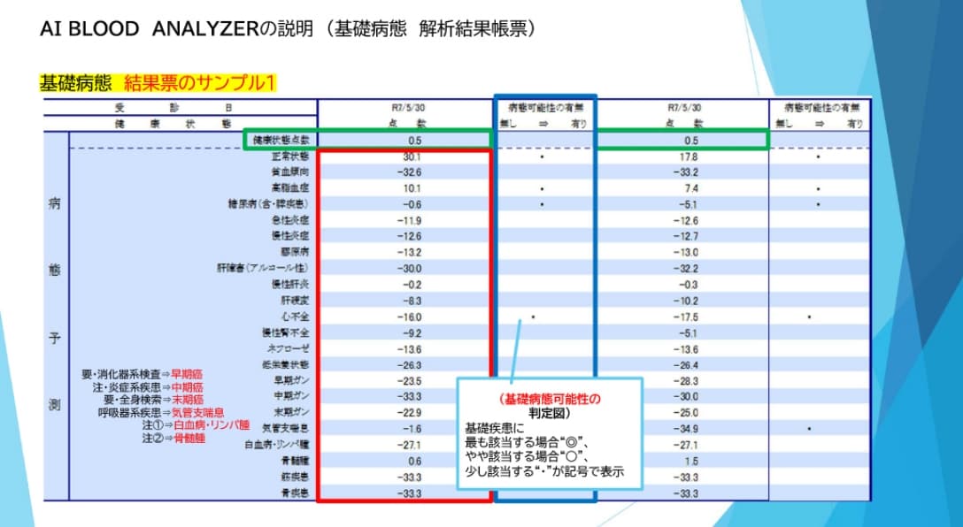 AI診断支援は、診断を下すためのものではなく、見落としやすい兆候を事前に示すための補助機能です。血液データの関連性や経年変化を解析し、数値が基準内でも疑うべき病態の可能性を可視化します。医師や保健師の判断を前に進めるための材料を提供する設計であり、現場の責任構造を壊しません。