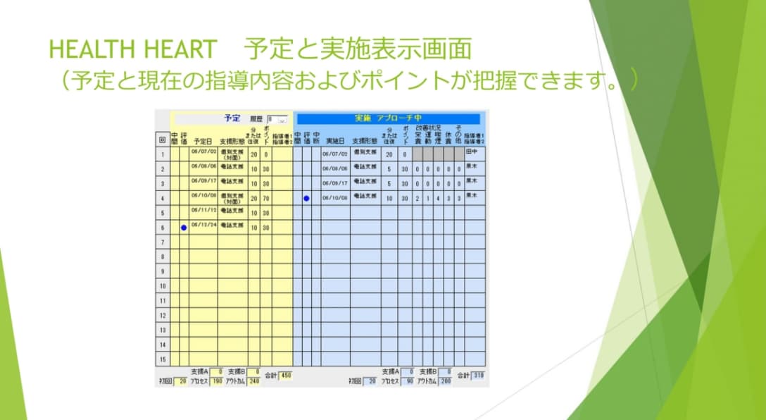 施設外での保健指導にも対応しており、必要なデータを端末にダウンロードして利用できます。面談後は、記録をサーバーへ一括で反映できるため、二重管理や転記作業が発生しません。巡回指導や出張指導が多い現場でも、同じ運用ルールで継続利用できます。